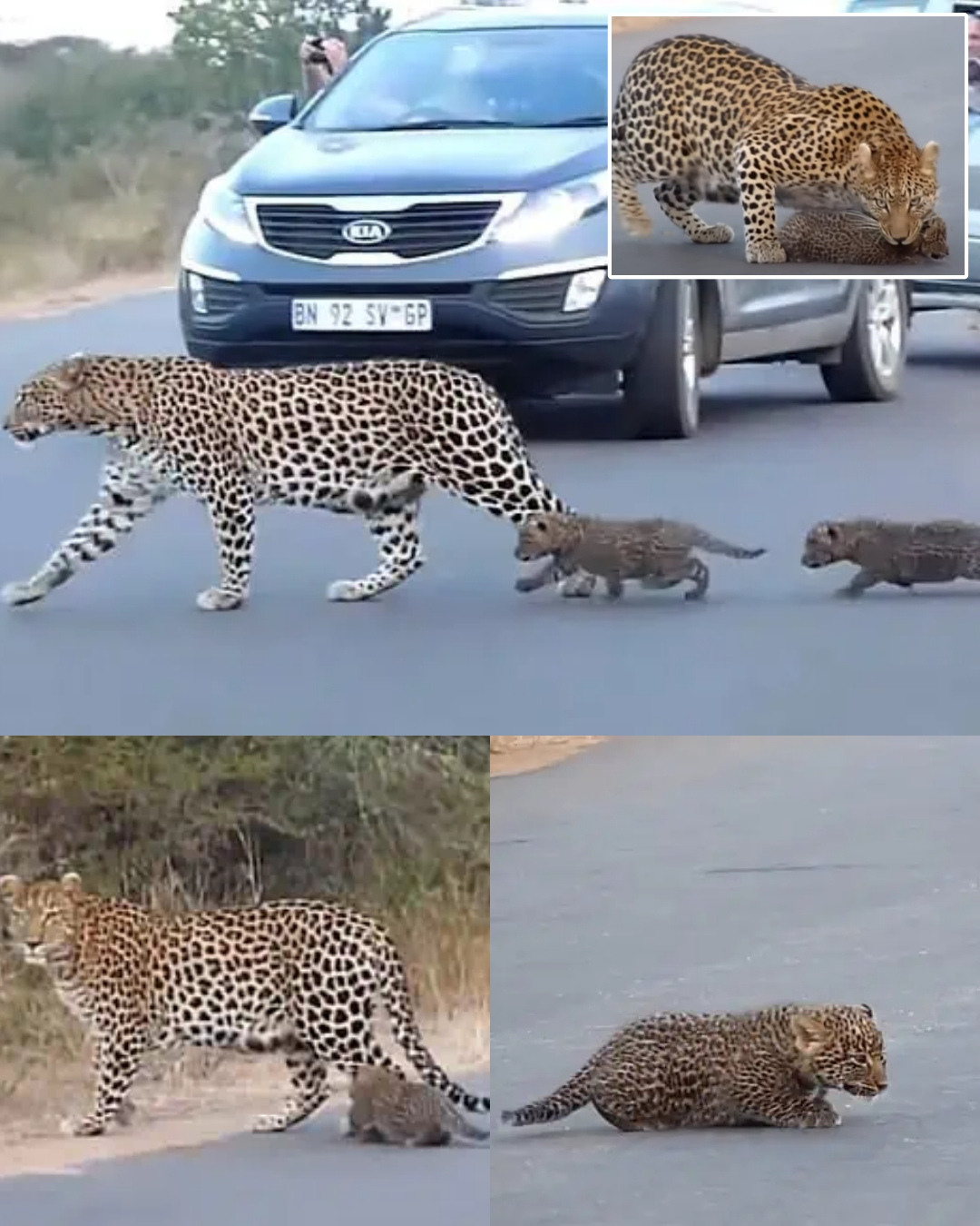 Adorable Leopards Cross Road with a Little Help from Their Mom.
