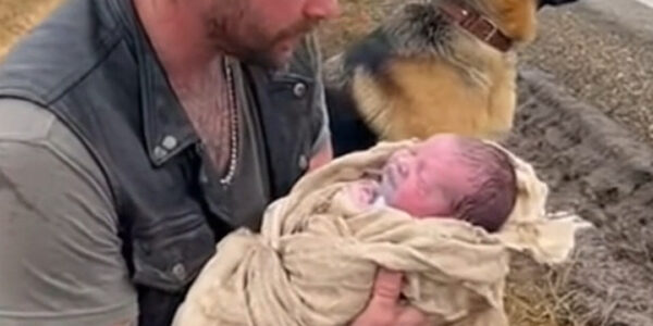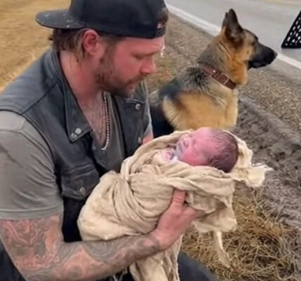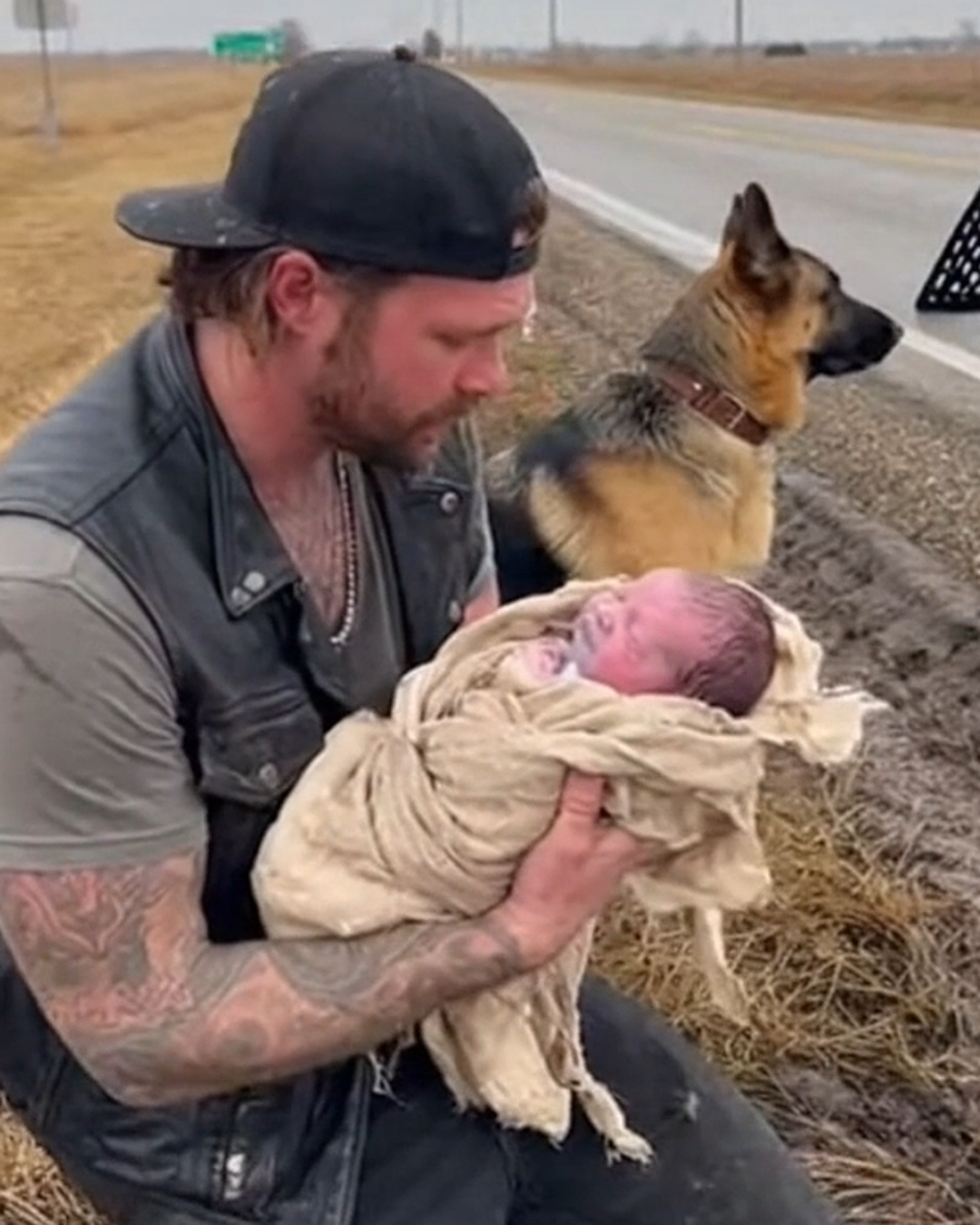 The road was empty when Tyler heard it. Not traffic.Not wind. A cry. Thin. Broken. Too small to belong out here. He killed the engine fast. Silence swallowed everything. Rex, his shepherd, stiffened beside the bike, ears forward. The sound…