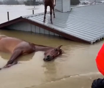 In the midst of a devastating flood, under a gray, unforgiving sky, a young brown horse with a striking white blaze stood precariously on the sloped metal roof of a submerged barn. His legs trembled with exhaustion after hours —…