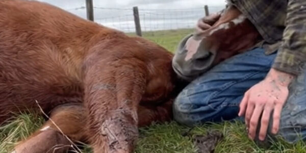 Gravel crunched under Jake’s tires as he slowed at the roadside pullout. The sun was sinking low, spilling deep orange light across the dry hills. He was about to drive on when something dark near the fence line caught his…