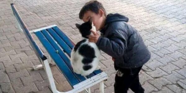 A Quiet Moment of Kindness: A Boy’s Gentle Kiss to a Stray Cat.