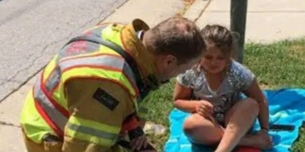 Sometimes, the most powerful acts of heroism aren’t performed with hoses, ladders, or flames licking at the sky — they’re performed quietly, in the grass, with a child who has lost everything. The photograph was taken after a devastating house…