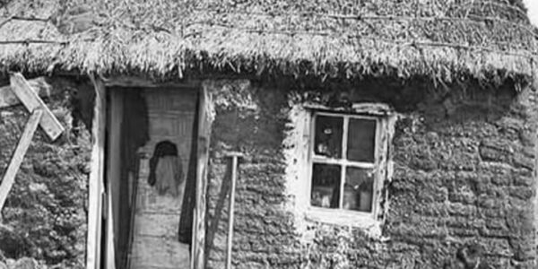 This photograph, taken around 1900 in County Antrim, Ireland, might look quaint to us now — a little cottage with its thatched roof and leaning shovel, a woman sitting outside in the grass, and a cat resting by the door….