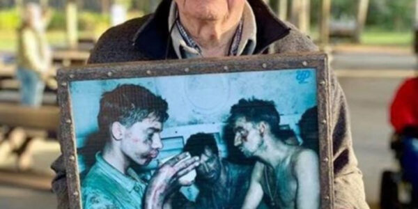 Ninety-eight years old — and still holding the photograph that captured the moment he realized he was alive. In the faded 1944 picture, Marine Private First Class Faris “Bob” Tuohy sits on the left, clutching a cup of hot coffee…