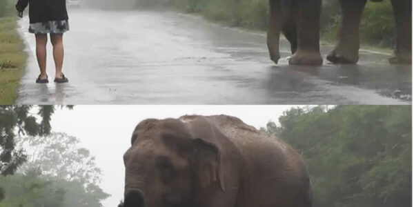 The rain fell softly that day, not in heavy sheets, but in a gentle drizzle that seemed to slow the world just enough for something extraordinary to happen. On a narrow road shared by humans and the wild, traffic hesitated….