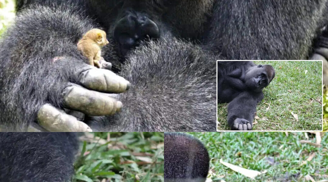 Cradled in Bobo’s hands was something impossibly small—a bush baby, no larger than his palm. Its wide eyes blinked slowly. Its tiny body rested against the gorilla’s chest as if it belonged there.