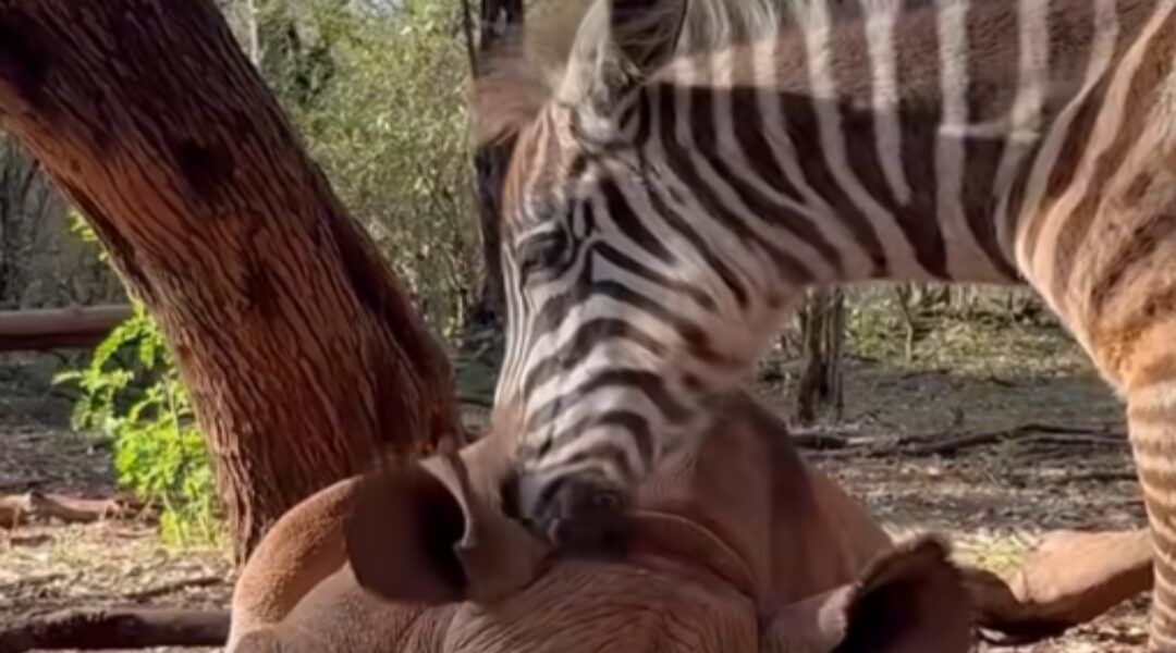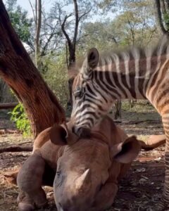 To an outsider, it might have looked unusual—a zebra grooming a rhino, two different species sharing a quiet space beneath the trees. But to those who watched closely, it was something deeply familiar.
