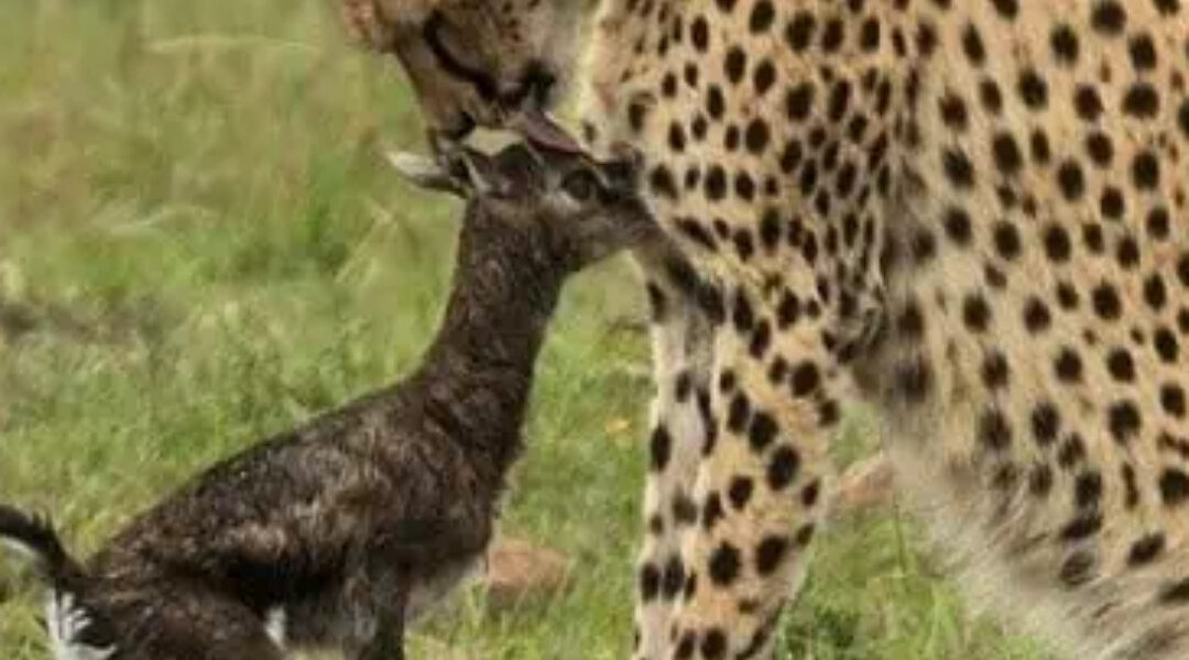 Instead of striking, the cheetah stopped. She lowered her head, sniffed the newborn gently, and brushed her face against its tiny body. The gesture was almost maternal — a soft nuzzle, a delicate rub of her head, as though she had mistaken it for her own lost cub.