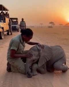 As she knelt beside him, the dust swirling around them, Aisha’s hand gently made contact with the calf’s warm, wrinkled skin. “Easy, little one… I’ve got you,” she whispered softly, her voice filled with calm reassurance. She could feel the weight of the animal’s tiny body, the tremors of fear and exhaustion vibrating through her own hands. The calf gave a weak trumpet, its voice barely a whisper against the wind. Then, without warning, he leaned heavily into her side, seeking comfort in the warmth of her embrace.
