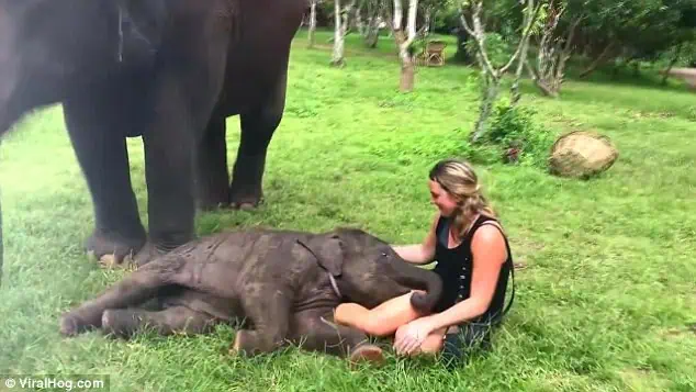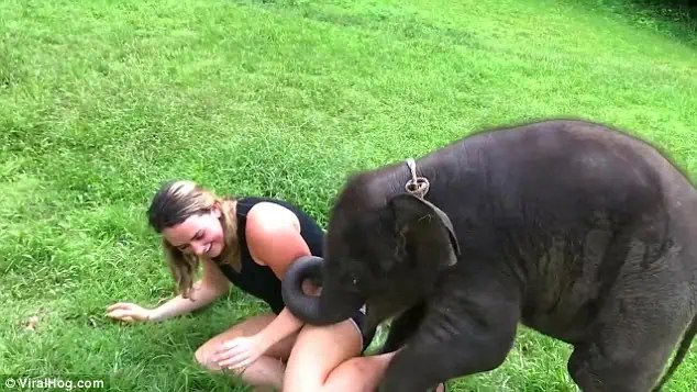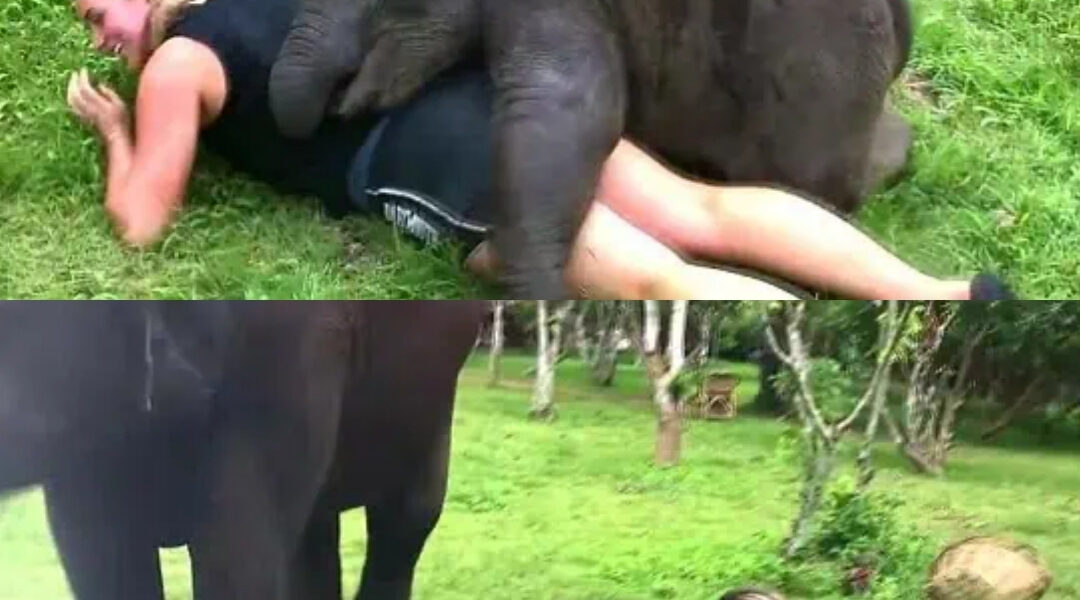 It began simply — a curious trunk reaching out, exploring. Suki wrapped her soft trunk around the woman’s arm, tugging gently as if to say, “Come play with me.” The woman giggled, surprised but delighted. When Suki’s first attempt at a hug didn’t quite work, she tried again — this time nudging the woman off balance and lowering herself down beside her.
