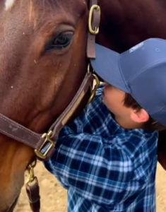 In the background, a few people moved quietly, finishing the final preparations. The trailer engine rumbled to life. The mare’s ears pinned back for a moment, then relaxed again as the boy continued to hold her close, whispering gentle reassurances.