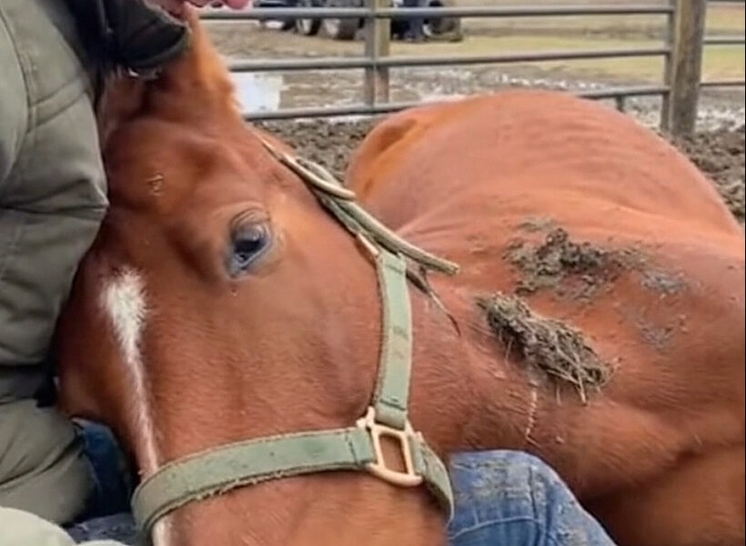 Erin stood in the freezing mud pen, the cold seeping through her boots as she waded toward the mare lying there, her body sunken, ribs stark against the thin fur. The animal’s breathing was labored and shallow, each gasp a reminder of the suffering it had endured. The sores along her sides were raw, and her eyes, once bright, now reflected only exhaustion and neglect. It wasn’t supposed to be like this. Erin’s heart ached at the sight, but she didn’t hesitate. She knelt beside the mare and gently laid the animal’s heavy head in her lap.