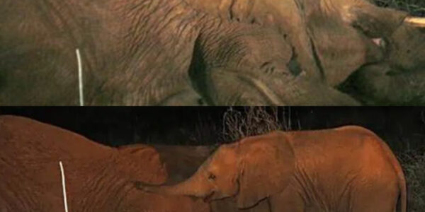 In the quiet stillness of the African night, where the wind moves softly through the grass and stars stretch endlessly across the sky, a small figure stood unmoving beside a far larger one. A five-month-old elephant calf pressed his forehead…