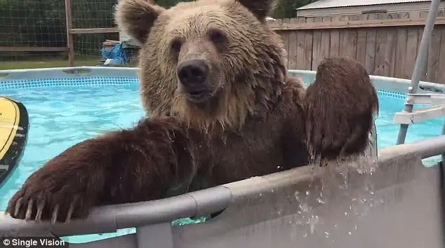 But Bruiser isn’t done. After his plunge, he spends his time splashing, paddling, and playing with his favorite poolside accessory—a surfboard. It’s a humorous yet heartwarming sight: a grizzly bear with massive claws balancing and nudging a surfboard around the pool as though it were an inflatable toy.