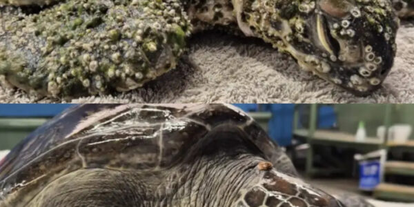 When strangers first saw her, they thought she was already gone. She lay motionless on the sand, her once-strong body sunken, her shell hidden beneath thick layers of barnacles, algae, and leeches. Waves curled around her like they were trying…