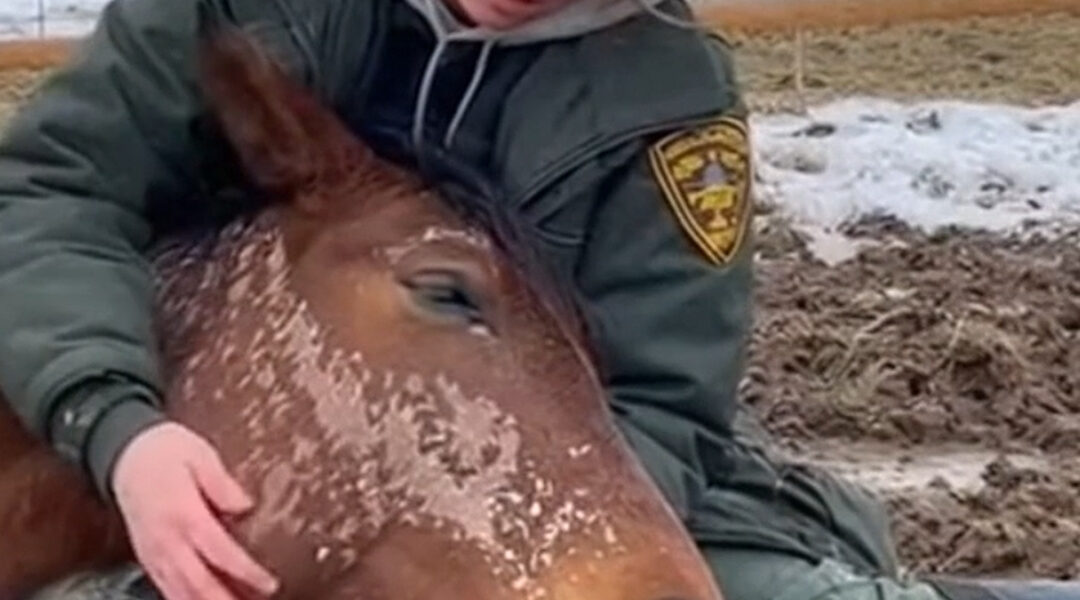 She kept her arm wrapped firmly around the mare’s neck, her other hand steady at the jaw, refusing to let the head touch the ground again.