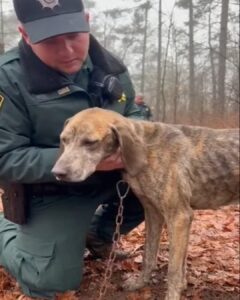 A hound, brindle-coated, ribs sharp beneath stretched skin, a heavy chain looped cruelly around his neck and locked tight against the trunk. The ground beneath him was stripped clean from endless pacing — step after step, day after day, until even the strength to stand had left him.