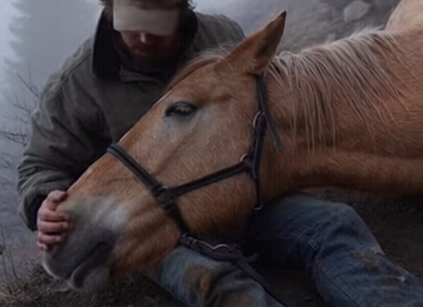 He slipped his arms carefully beneath the horse’s neck, lifting the heavy head slightly so it wouldn’t grind into the rocks.