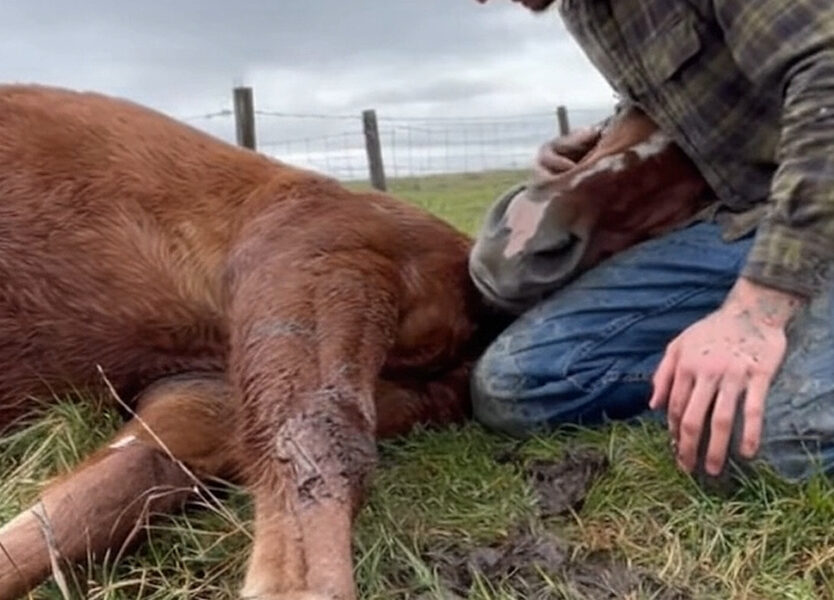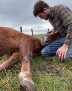 One of its front legs was twisted awkwardly, tangled deep in strands of broken fencing wire that had been ripped loose during the storm. Mud streaked its coat. Foam clung to the edges of its mouth.