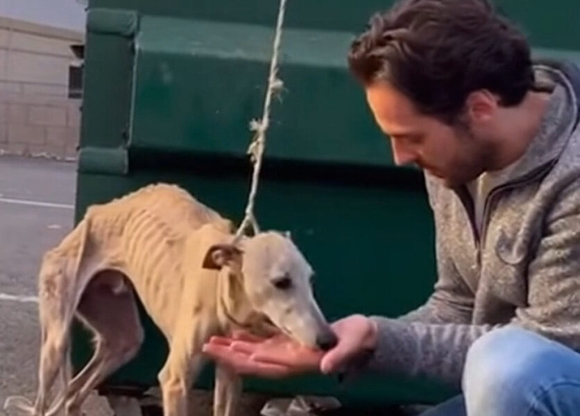 Behind the dumpster, tied to one of the metal handles with a thin rope, stood a greyhound so thin it barely looked real. Its ribs pushed sharply through patchy fur, hips jutting out like bones beneath skin.