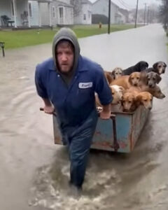 They appeared out of the storm like ghosts—small dogs, big dogs, old dogs, young ones—all driven by the same instinct: find shelter or disappear. They slipped under half-submerged fences, swam across flooded yards, followed the smell of warmth and oil and something steady.