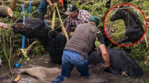 Word spread quickly through Linwood. Neighbors, friends, and emergency responders answered without hesitation. Soon, a group had gathered around Javier, each determined to save the horse that had survived the storm. Together, they devised a plan—ropes, steady pulling, and coordinated teamwork. It was grueling work. Mud clung to their boots, muscles burned, and at times it seemed impossible. But inch by inch, they worked as one.