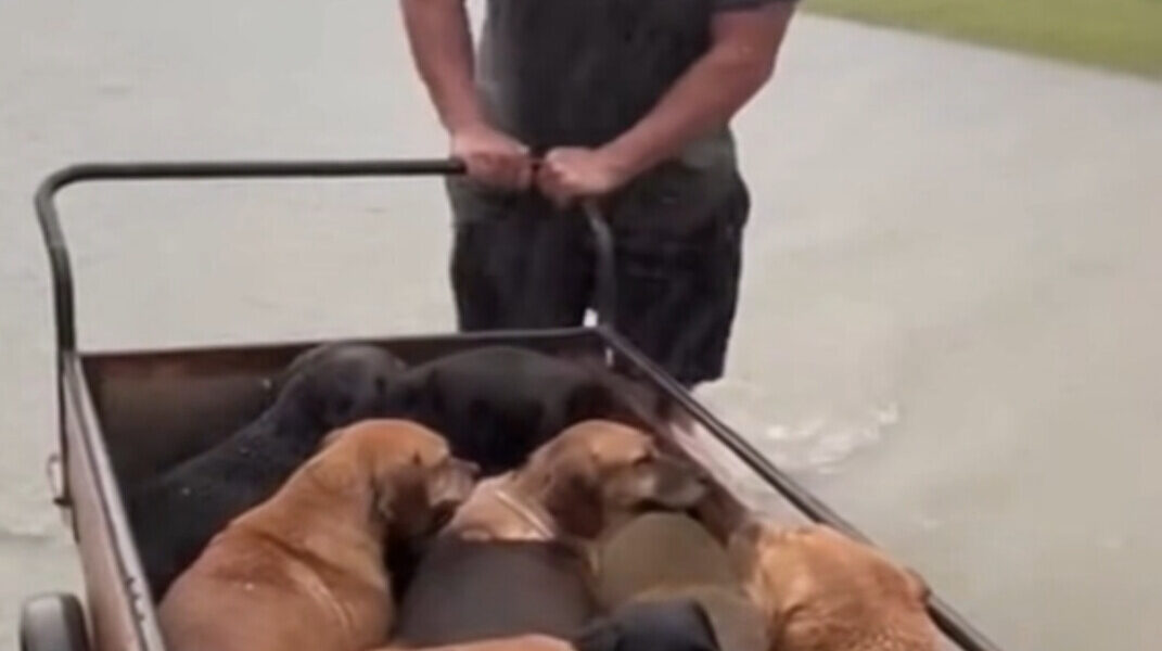 The water climbed higher, tugging at his waist, cold and relentless. Each step felt like lifting his legs through cement. The cart rattled, threatening to tip, and Evan adjusted, angling it just enough to keep the dogs centered.