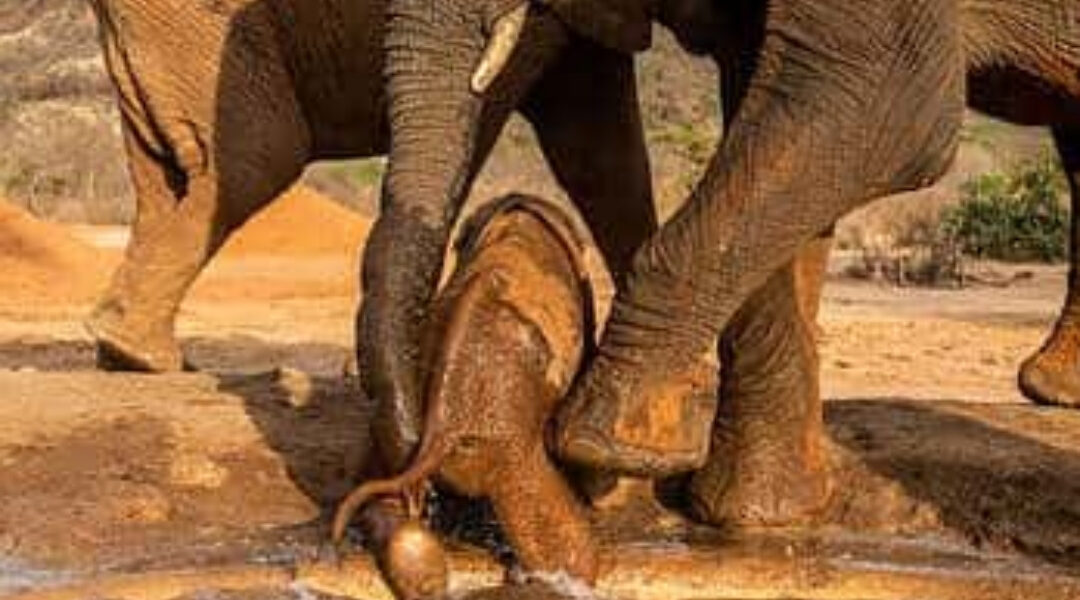 A small, fragile shape on the earth, surrounded by dust and two distressed elephants — Makena and Ishanga — trying desperately to nudge her back onto her feet.