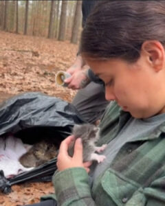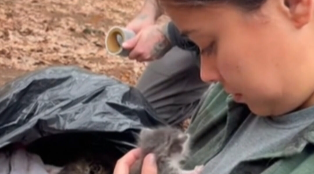 Her hands moved faster now, slicing the bag open, pulling plastic apart as leaves stuck to her palms. Inside were kittens. Tiny bodies tangled together, fur matted, eyes closed. Too still. Too quiet.