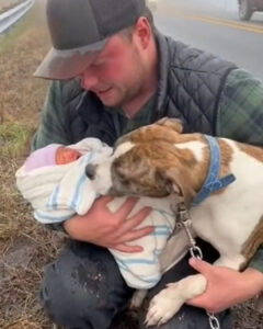 The puppy licked the baby’s blanket again, slow and careful, then rested its head against Mark’s forearm, eyes finally closing for a moment. The baby cried softly, stronger now, the sound cutting through the fog like a promise.