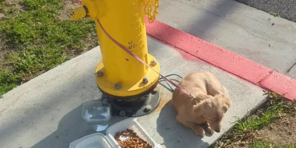 She was only eight months old, a cinnamon-colored pup tied to a sun-bleached hydrant with a leash knotted tight as a fist. Someone had left a plastic tub of food and a small jug of water nearby—evidence of a goodbye…