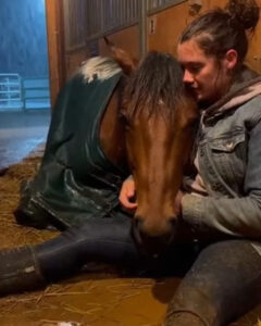 “Hey… girl,” she whispered, pressing her cheek lightly against the mare’s damp mane. “Easy… I’ve got you.”