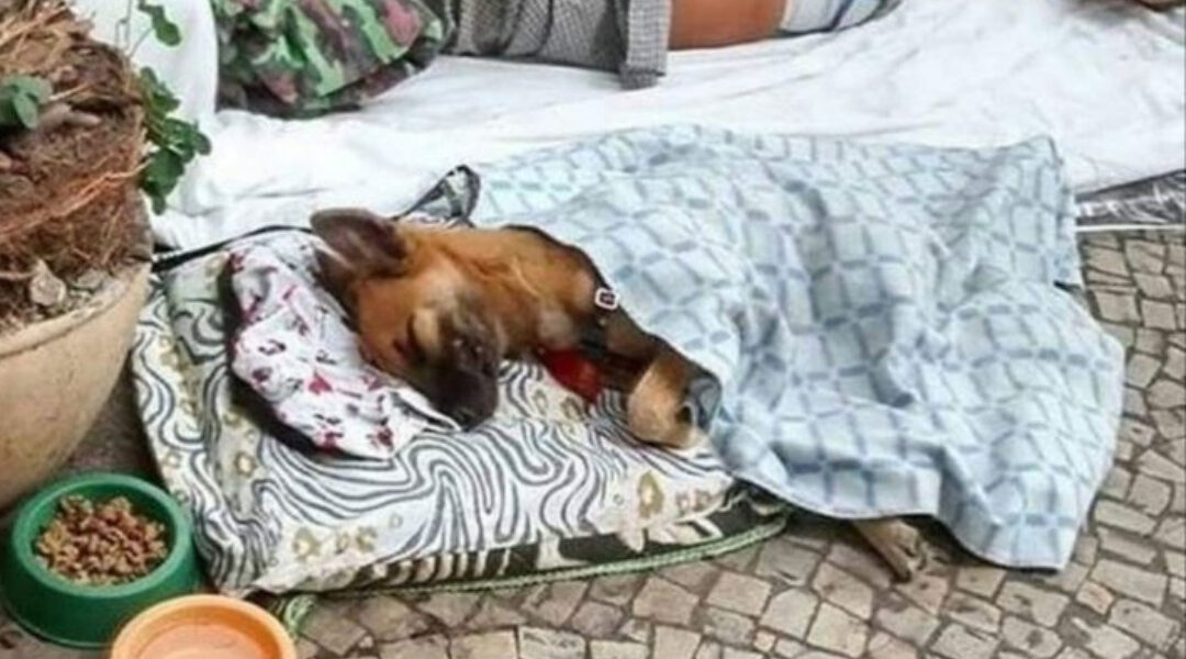 The man spreads out a thin sheet, worn but clean. He lays down first, then gently pats the smaller blanket beside him. The dog — a tan, loyal creature with kind eyes and a tired body — knows the signal well. He circles twice, lies down, and the man pulls the blanket up over his tiny shoulders. The dog sighs, closing his eyes as if to say, “We made it through another day.”