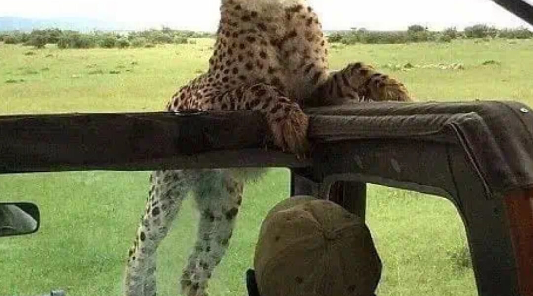 But instead of leaping onto the hood, the young cheetah miscalculated and jumped directly into the open back seat, landing only a foot away from Mickey.