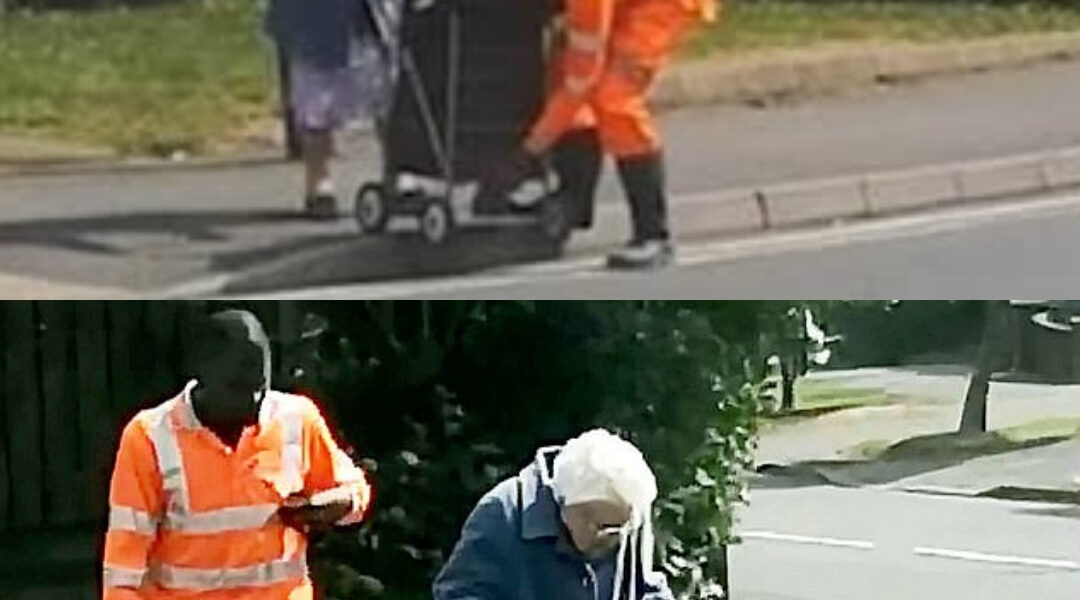 Dressed in his bright orange uniform, he approached gently so as not to startle her. “Let me help you, ma’am,” he said softly. He lifted the walker, steadying it over the curb, then offered his arm as she took the last few careful steps across the road.