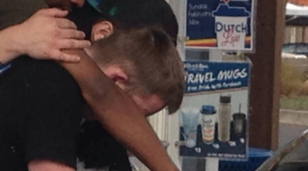 A bystander waiting in line took a photo — three young men leaning from a coffee stand window, their hands joined in a circle of compassion around a grieving stranger. The image spread quickly online, and hearts around the world were moved by its simple, unspoken power.