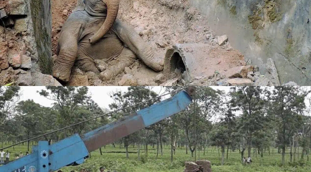 Down inside the narrow concrete trench, unable to move more than a few inches in any direction, was a young elephant calf — no more than a year old, its small body wedged between cold stone walls. Its legs were trapped beneath it, its head pressed awkwardly against the side, its skin streaked with dirt and fear.