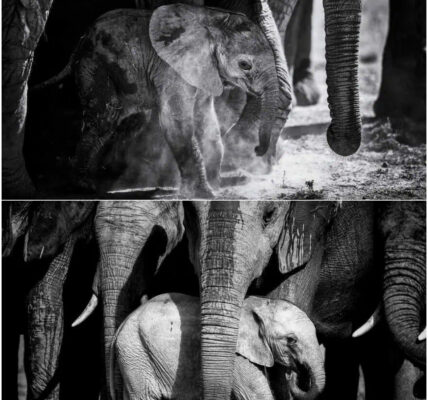 The herd erupted in panic. The mother lunged toward the river, trumpeting frantically, her massive feet pounding the soil. The other elephants circled restlessly, their ears flaring, their cries echoing through the valley. But the current was strong, pulling the tiny body downstream. The calf’s trunk flailed, struggling to stay above the surface. Each time it rose, water poured down its face. Each breath seemed borrowed from the river itself.