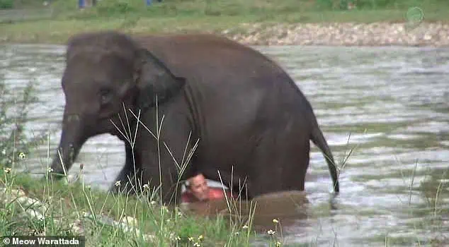 She pushed through the current, her trunk reaching for him, wrapping around his body. At one point, she even tried to lift him with her leg, determined to shield him from harm.