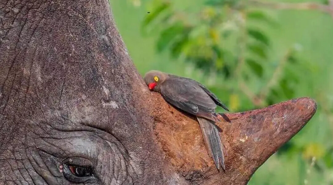 The bond between rhinos and oxpeckers is one of nature’s most fascinating partnerships. The birds spend their days perched on the backs of these gentle giants, plucking parasites and insects from their skin. The rhinos, in turn, tolerate — even welcome — their tiny companions. Locals often refer to the oxpecker as the “rhino’s guard,” because it chirps loudly whenever danger approaches, warning the rhino before its poor eyesight can.
