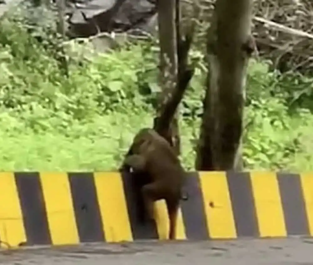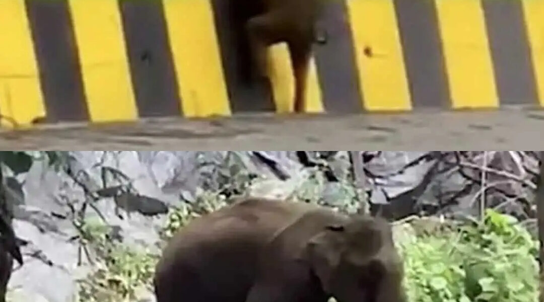 The herd had been moving toward the forest after an early search for food when they reached a stretch of concrete — a roadside barrier dividing their path. To the adults, it was nothing. A single, effortless step. The mother and the older calf crossed quickly, their heavy feet thudding softly against the ground on the other side. But for the smallest one, the world suddenly stopped.