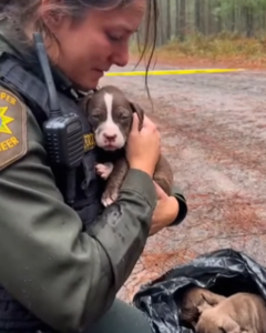 Elena tore through the final black trash bag with trembling hands. The yellow police tape snapped sharply in the cold breeze along the deserted logging road. The moment the plastic ripped open, a faint rustle revealed the heartbreaking scene: a tiny pit bull puppy, barely alive, gasping weakly beneath the still, cold bodies of his siblings.
