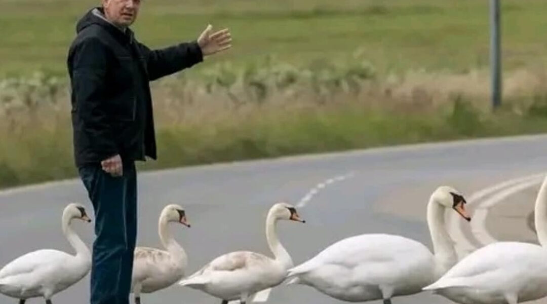 In single file, the entire family — father, mother, and their seven chicks — fell in line behind him. The sight was almost storybook, a real-life echo of Make Way for Ducklings. Jos raised his arms gently to pause cars, halting traffic as he became both guide and protector. Drivers stopped, curious onlookers stared, and the swans kept marching, their webbed feet slapping softly against the pavement.