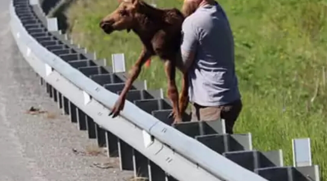 A mother moose stood anxiously at the roadside, pacing, her muscles tight with fear. Beside her, a tiny calf — all legs and wobbling determination — tried desperately to follow her across the highway. But the guardrail was too high, too sharp, too unforgiving for a newborn who’d barely learned to stand.