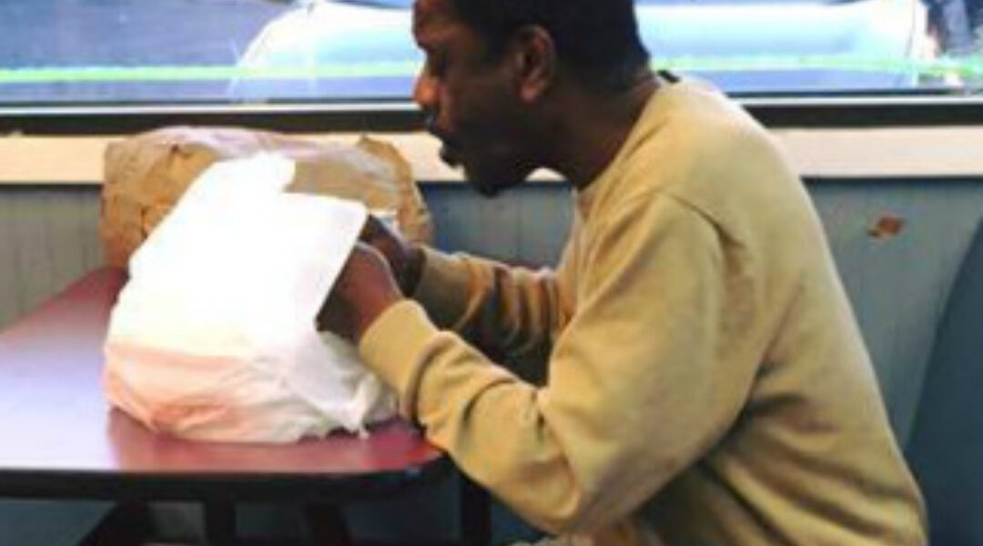 The restaurant was almost empty — just the hum of the fryer and the faint sound of traffic outside. He sat alone in the corner booth, his hands folded around a small white paper bag, as if it contained something far more precious than food.