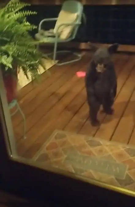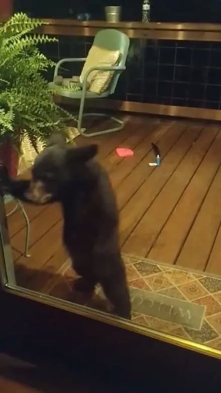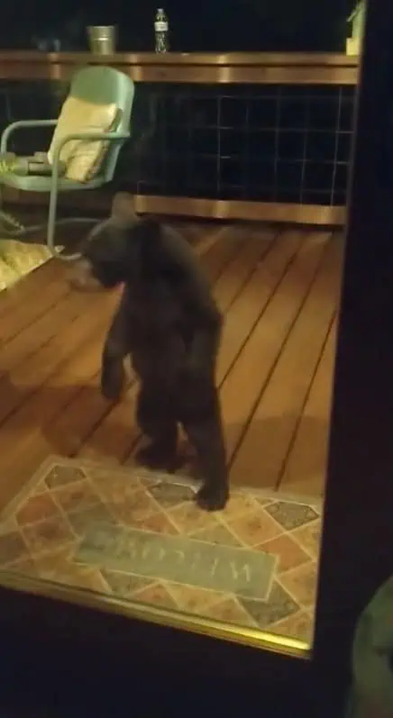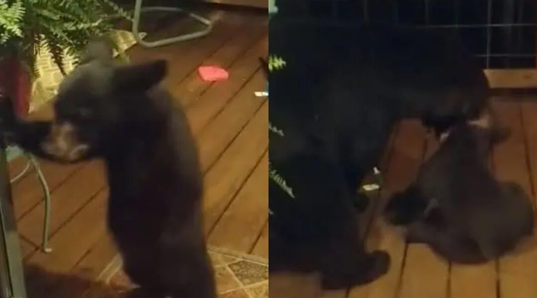 Standing at their front door, small paws pressed against the glass, was a bear cub — wide-eyed, wobbly, and utterly fascinated by the humans inside. It stood on its hind legs, peering in like a child hoping to be invited for breakfast.