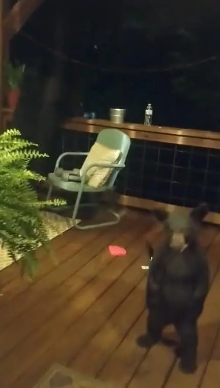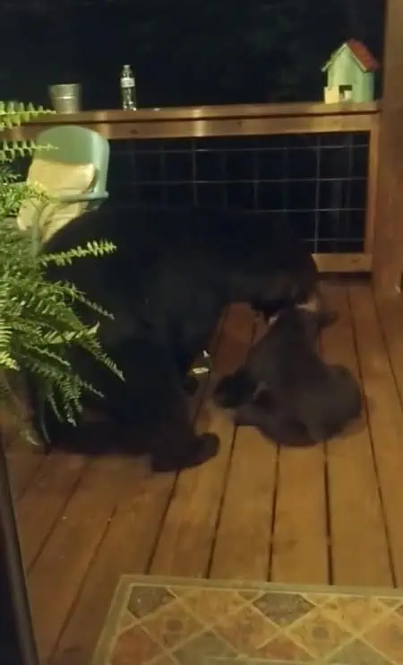 The cub lowered its head and shuffled backward as if apologizing, before the mother turned and led it gently off the porch. Within moments, both vanished into the night, their dark shapes melting into the trees.
