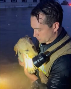 He pressed the trembling body against his rescue vest, using one arm to hold the pup close while turning back toward the rescue boats waiting farther down the flooded street.