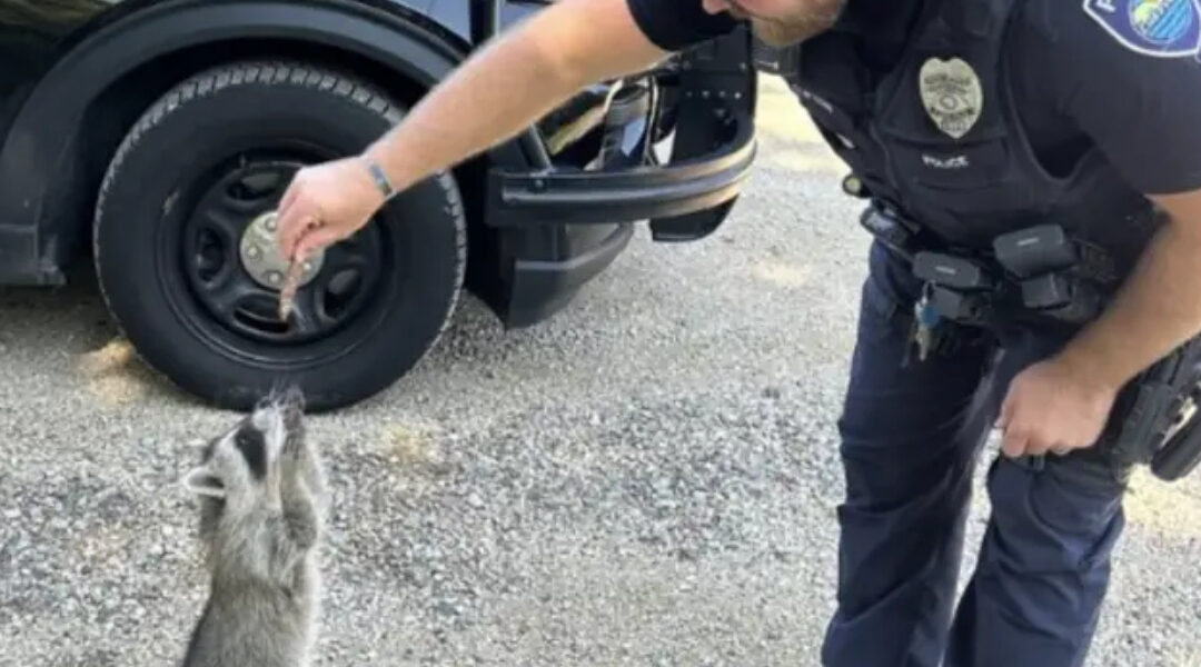 It’s rare — incredibly rare — that an emergency call ends with officers laughing, petting a raccoon, and trying to keep him from climbing into their cruiser for a ride-along.
