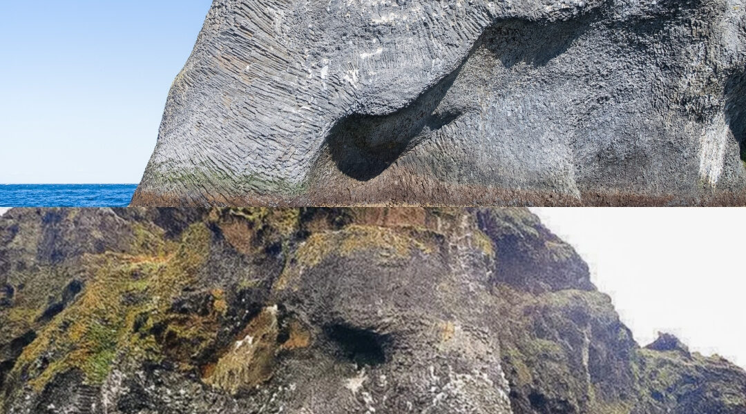 The cliff is formed entirely of basalt, a rock born from rivers of lava that cooled so quickly they cracked into deep folds and creases. Those wrinkles — carved by fire, sculpted by the ocean — resemble the tough, aged skin of an elephant. The kind you might see wandering across African plains, except here it is frozen in stone beneath northern skies.